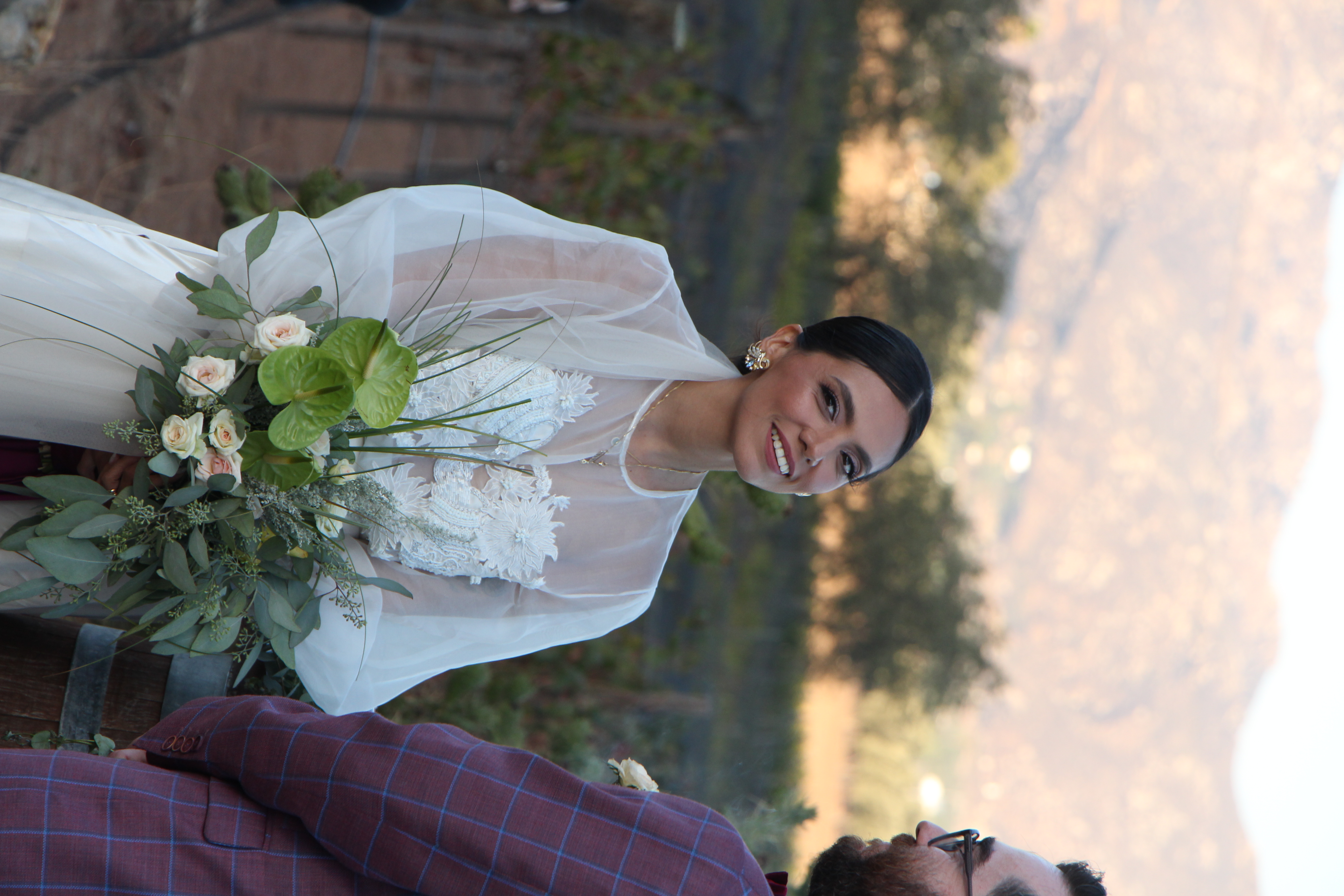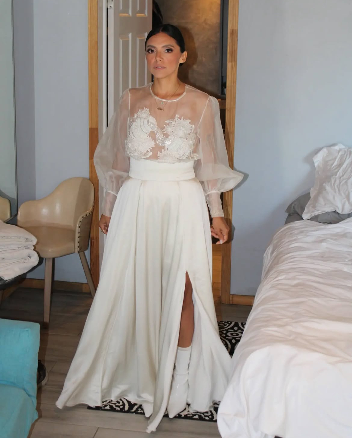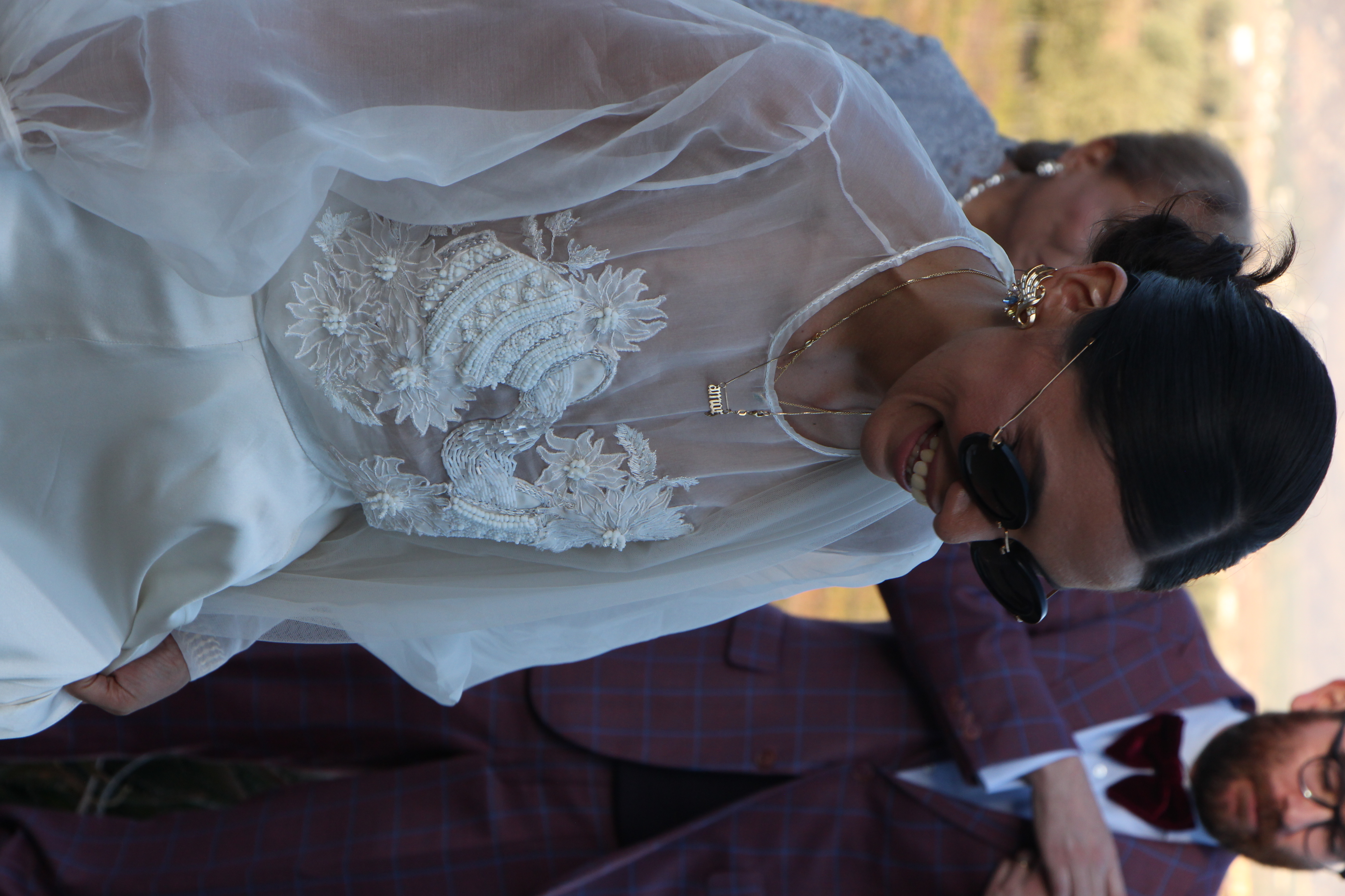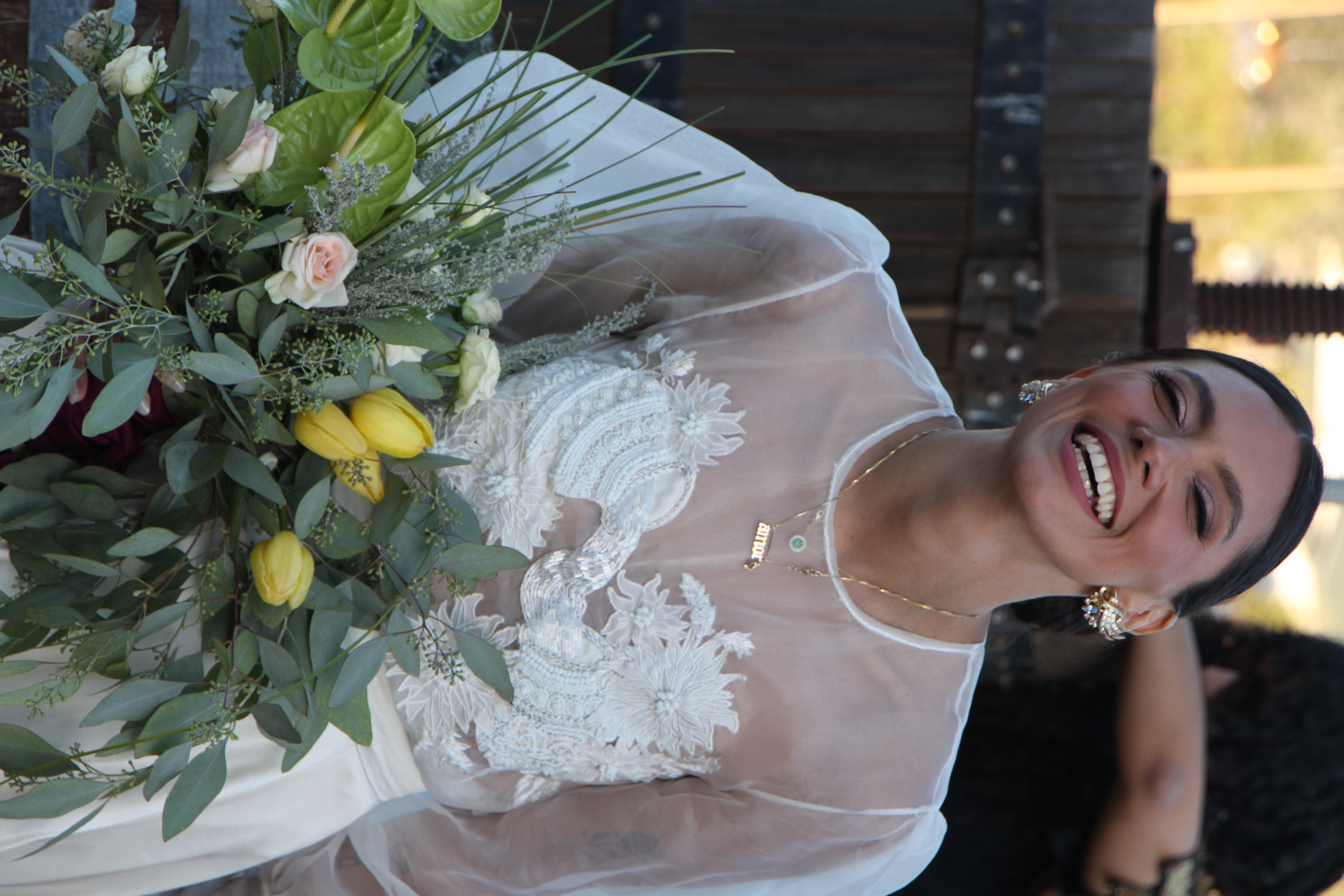Hand embroidered and beaded commissioned wedding dress. Custom made embellished top made out of silk organza and silk satin skirt. Motifs were inspired by Annie’s favorite flower the Dahlia, and the Tarot cards that represented her at the time. Then illustrated, designed, embroidered, and embellished by hand.