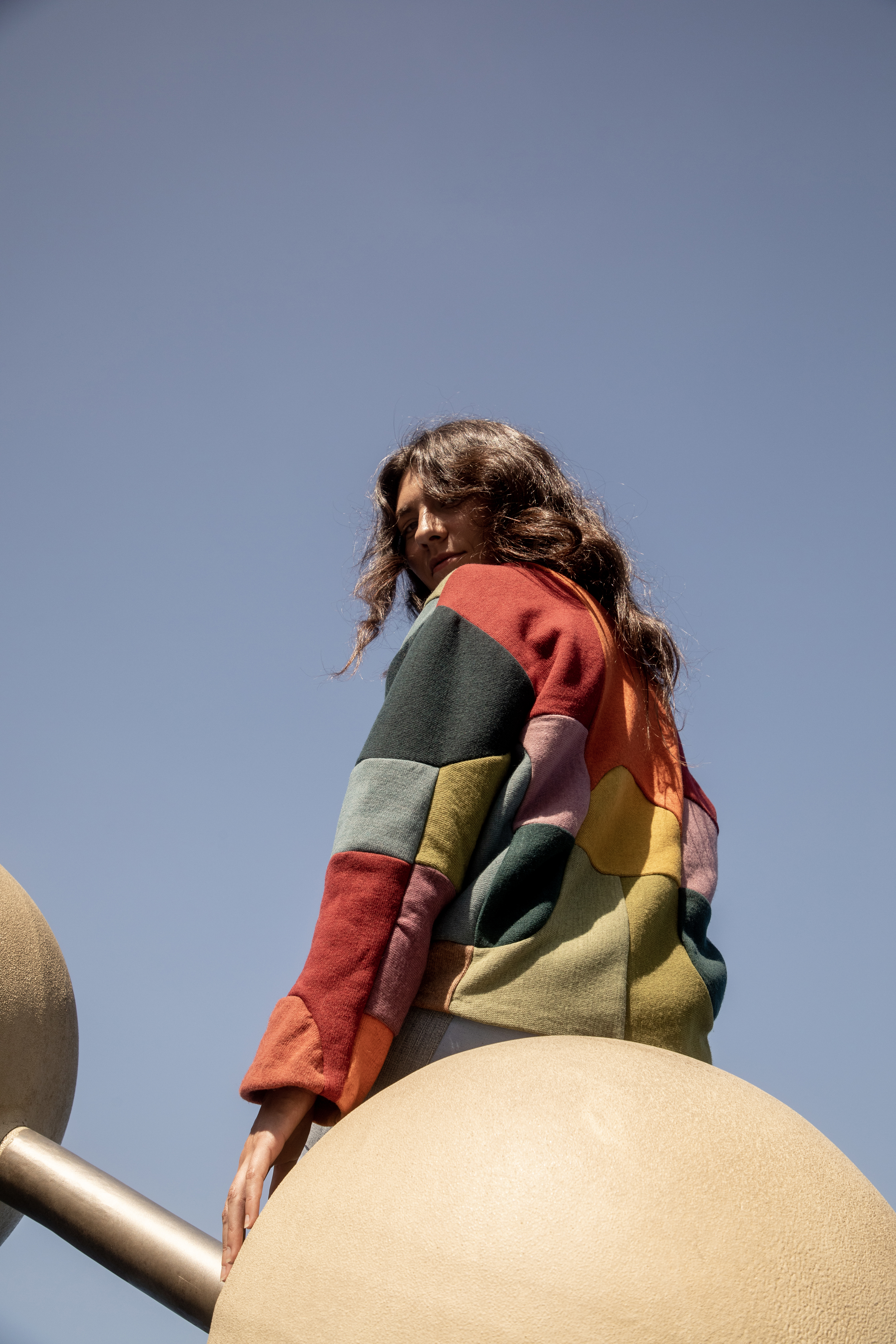 A series of reversible patchwork cardigan sweaters made from remmenants of the cotton-wool sweaters that have been saved since the first cut in 2019. The denim pants also immitate the patchwork craft, are made from old jeans collected donated by family and friends, and an organza top with a hand beaded neck piece.